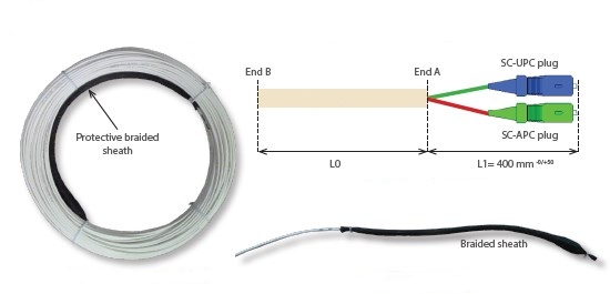 One-sided pre-assembled fiber optic drop cable with one SC/PC connector and one SC/APC connector. Fittingly assembled to be used in CPE's due to a different whip length of the two fibers.