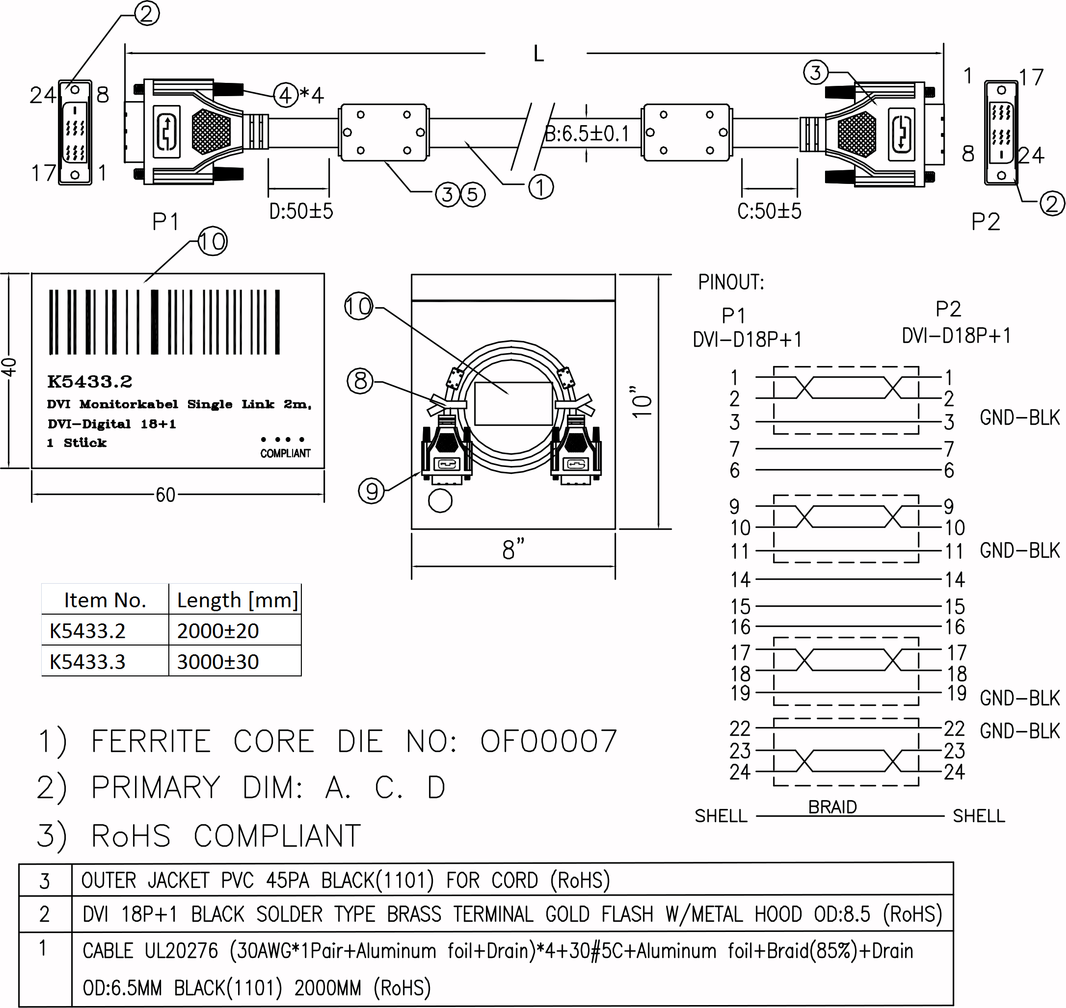 | K5433.2 | DVI-D Single Link Cable, 2x DVI-D 18+1, M-M, AWG 30, 2,0m, black | black | 2.0 m | 6.0 mm | 30AWG | |