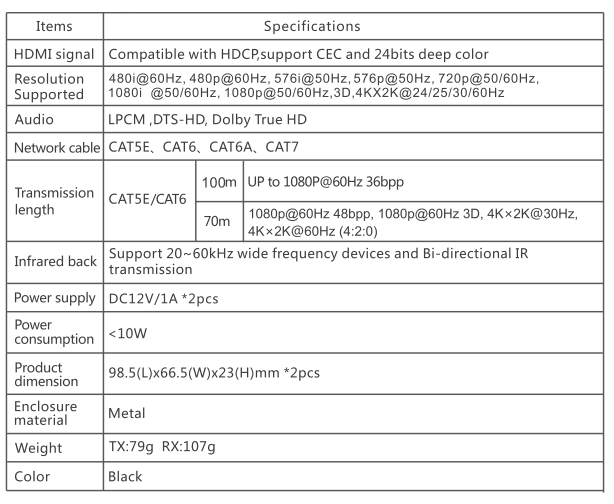 Including: HDBaseT Extender Set (Transmitter/Receiver), 2 x IR cable, 2 x power supply, quick manual