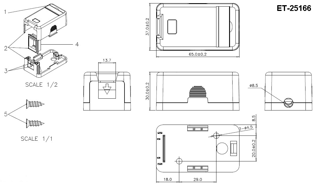 Dimensions ET-25166: 37 x 65 x 30 mm (L x W x D)