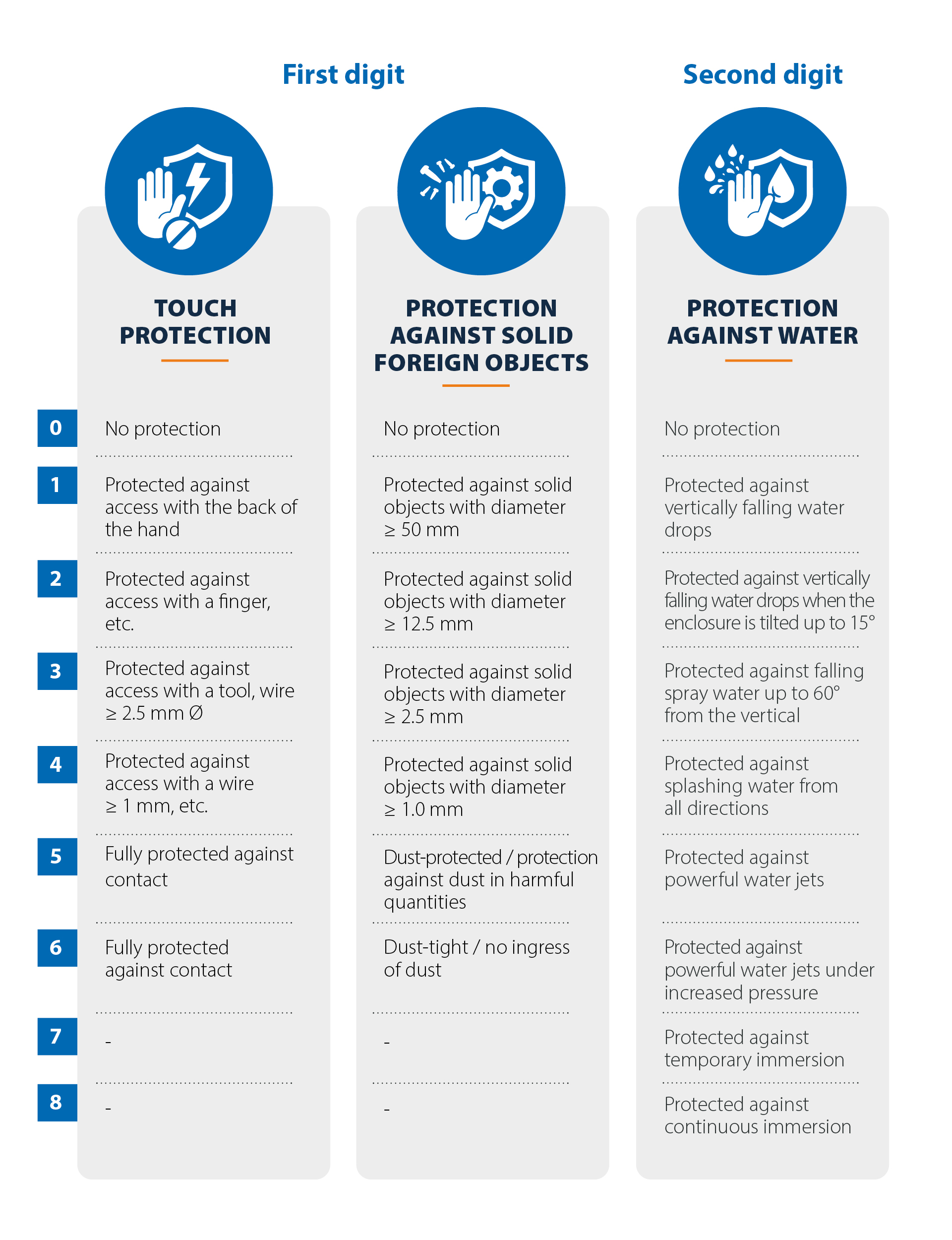 Uanset om det er vedvarende regn, sandstorm eller snestorm: elektronik skal beskyttes mod støv og vand, især udendørs. Til anvendelser udenfor eller i fugtige rum, støvede fabrikshaller eller endda under vand finder du passende produkter hos EFB-Elektronik. Vi forklarer, hvad IP-beskyttelsesklasserne går ud på, og hvad IP-betegnelserne betyder.