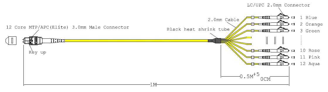 | MTPM12LCOS2-1 | MTP®/APC(M)-LC Fanout cable OS2 12 fibers Typ B LSZH yellow 1m | 1 x MTP® male | 12 | 12 x LC | 1.0 m |