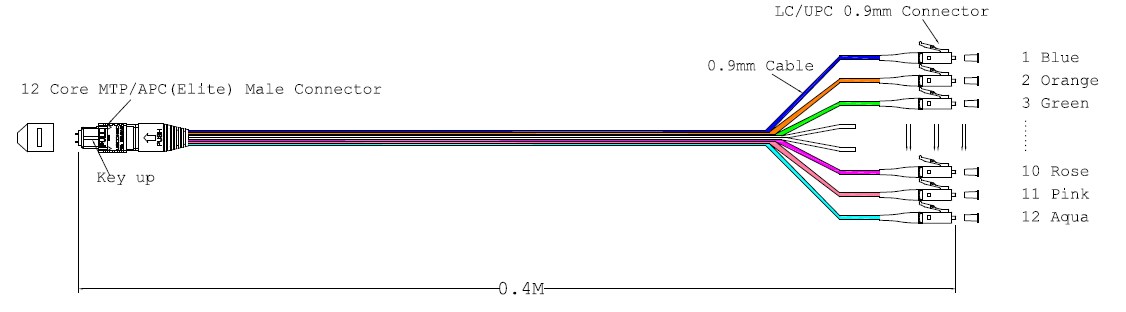 | MTPM12LCOS2-0,4 | MTP®/APC(M)-LC Fanout cable OS2 12 fibers Typ B LSZH yellow 0,4m | 1 x MTP® male | 12 | 12 x LC | 0.4 m | |