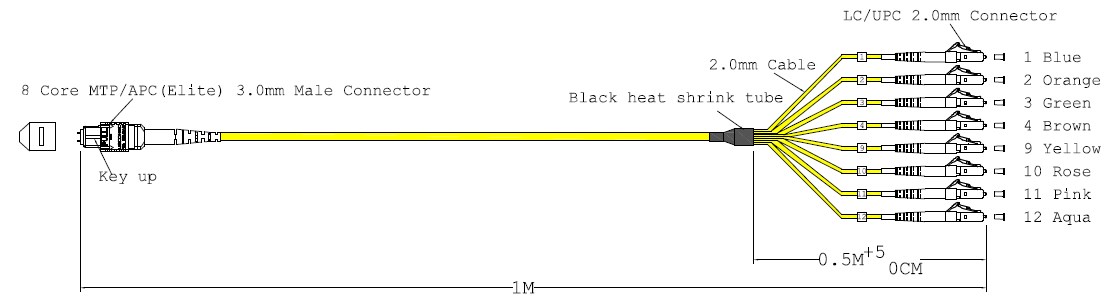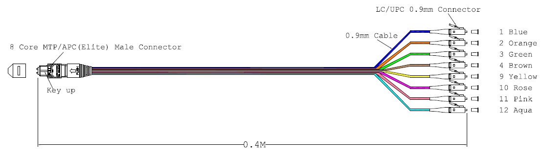 | MTPM08LCOS2-0,4 | MTP®/APC(M)-LC Fanout cable OS2 8 fibers Typ B LSZH yellow 0,4m | 1 x MTP® male | 0.4 m | 8 | 8 x LC | |