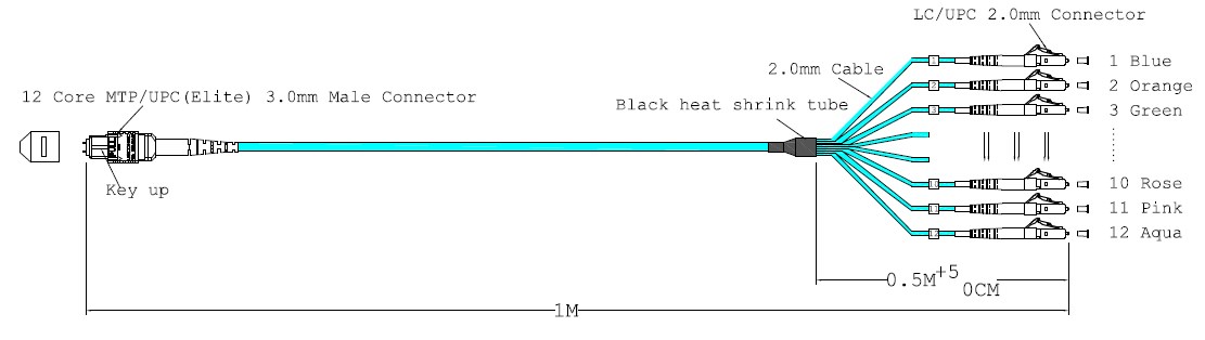 | MTPM12LCOM3-1 | MTP®(M)-LC Fanout cable OM3 12 fibers Typ B LSZH aqua 1m | 1 x MTP® male | 12 | 12 x LC | 1.0 m |