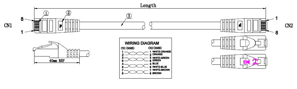 The assignment of the RJ45 plugs is 1:1 and follows TIA/EIA 568B .
