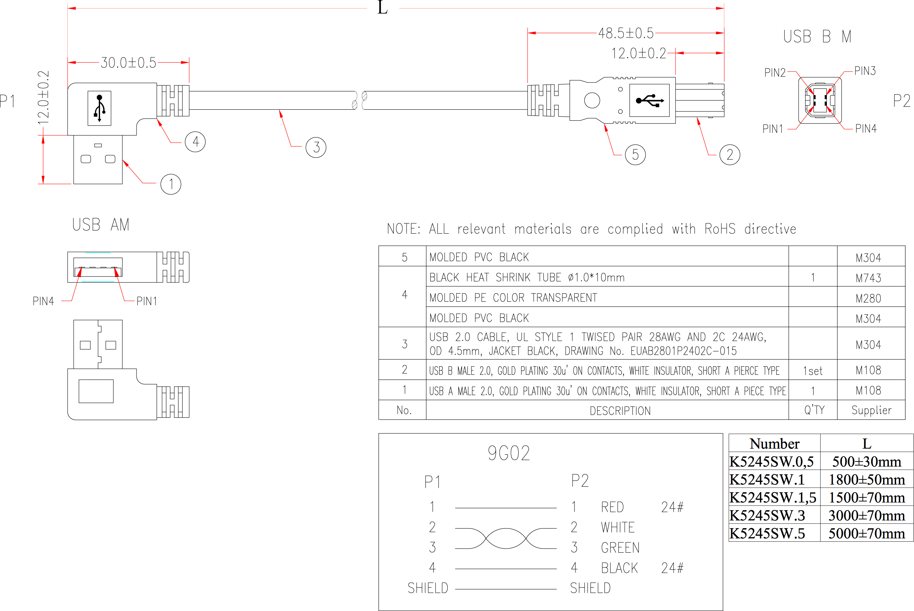| K5245SW.0,5V2 | USB2.0 Connection Cable A (angled)-B, M-M, 0.5m, black, Classic | schwarz | 0,5 m | 4.5 mm | 24+28AWG | |