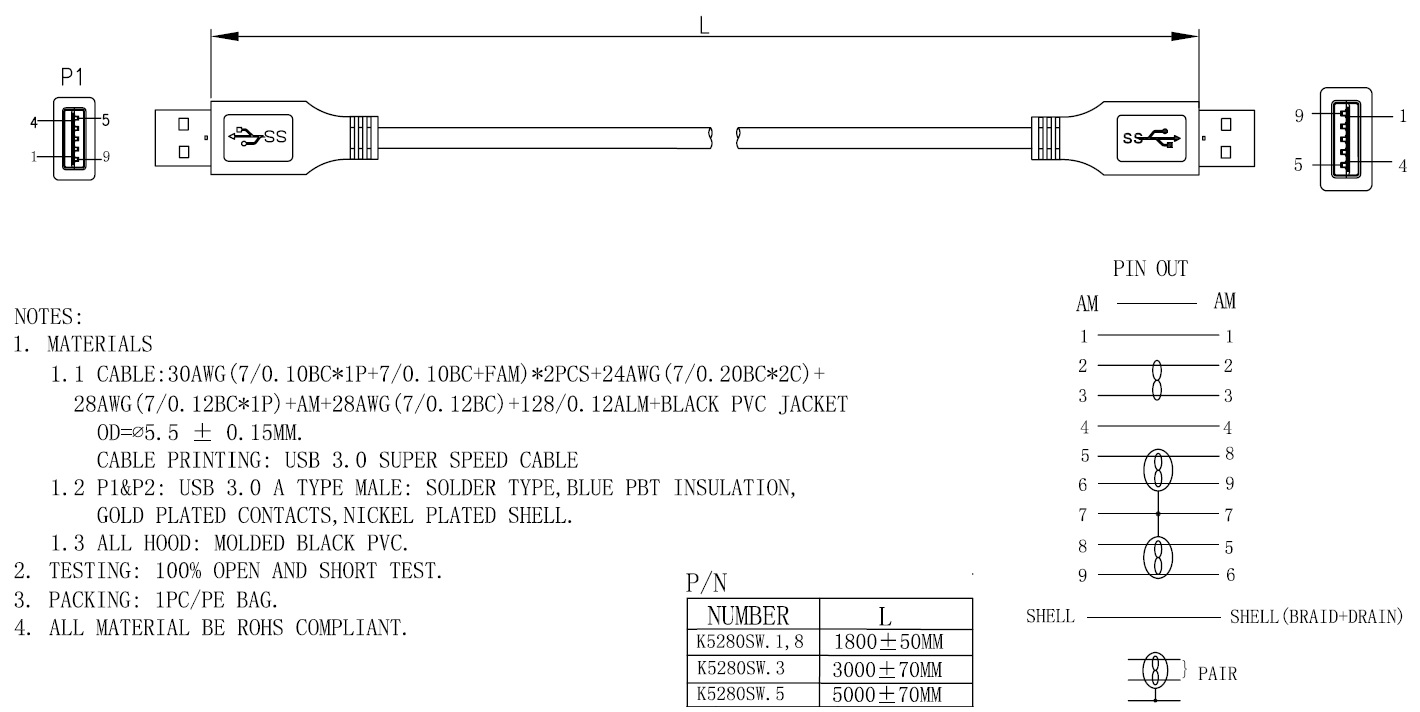 Für Datenübertragungsraten bis zu 5 Gbit/s. Leitermaterial: Kupfer. Leiteraufbau: AWG32 / AWG28 (1.0m) und AWG30 / AWG24 (1.8-5.0m). Umspritzte Stecker, PVC Mantel.